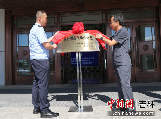 當天,琿春林區(qū)法院黨組書記、院長鄭國榮與琿春森林公安分局黨委書記、局長李本三共同為“執(zhí)行警務聯(lián)動辦公室”揭牌。兩家單位黨委成員以及40余位干警參加了揭牌儀式。揭牌儀式后,大家共同觀摩“執(zhí)行警務聯(lián)動辦公室”操作流程。