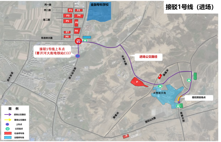 乘坐地鐵2號(hào)線在霧開(kāi)河大街站C口出站,換乘接駁1號(hào)線公交車(chē),前往冰雪新天地1、2號(hào)門(mén)。(如下圖)