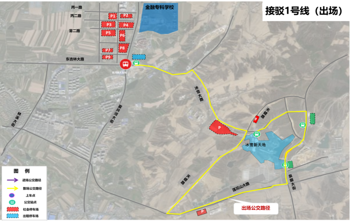 1號(hào)門(mén):游客在冰雪新天地1號(hào)門(mén)(天健路公交車(chē)臨時(shí)站點(diǎn))乘坐接駁2號(hào)線公交車(chē)返回地鐵霧開(kāi)河大街站B口,轉(zhuǎn)乘地鐵等交通方式離開(kāi)蓮花山。(如下圖)