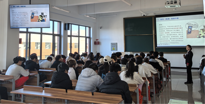活動現(xiàn)場,臨河街支行的工作人員結(jié)合高校校園詐騙的高發(fā)特點(diǎn),以通俗易懂的語言為師生們帶來了一場干貨十足的反詐宣講。宣講環(huán)節(jié)中,工作人員首先從“什么是電信網(wǎng)絡(luò)詐騙”切入,系統(tǒng)講解了電信網(wǎng)絡(luò)詐騙的定義、常見類型及隱蔽性、迷惑性特點(diǎn),讓師生們對這類違法犯罪行為建立起清晰認(rèn)知。隨后,通過“以案說詐”的形式,工作人員選取了近年來高發(fā)的校園貸、刷單返利、冒充老師同學(xué)借錢、虛假購物退款等典型詐騙案例,深入剖析了詐騙分子的作案手法、話術(shù)陷阱以及受害者的受騙心理,用真實(shí)案例敲響安全警鐘,讓師生們直觀感受詐騙的危害性。