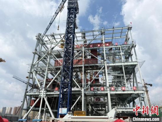 記者在施工現(xiàn)場看到,千余名工人與塔吊等機(jī)械協(xié)同作業(yè),安裝鍋爐鋼架、煙筒筒壁、冷卻塔、脫硫設(shè)施等關(guān)鍵設(shè)施。