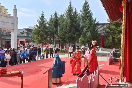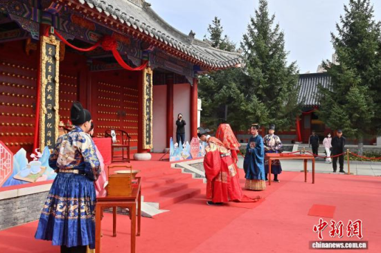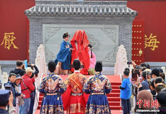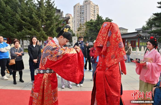 10月7日,吉林長春文廟舉行了一場明制漢婚沉浸式展演。漢服愛好者依次呈現(xiàn)奠雁、同牢、合巹等傳統(tǒng)禮儀,生動還原明代婚俗。現(xiàn)場通過流程講解與道具展示,解讀禮儀背后古人對婚姻與美好生活的寄愿。中新社記者 張瑤 攝