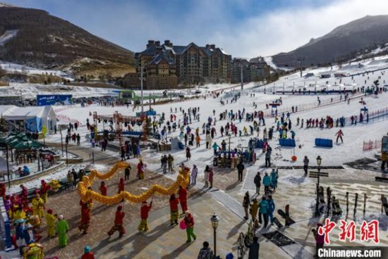 圖為1月23日,太舞滑雪小鎮(zhèn)年味十足,傳統(tǒng)舞龍舞獅等民俗表演吸引游客在滑雪間隙駐足觀看。 中新社發(fā) 河北省張家口市崇禮區(qū)委宣傳部 供圖