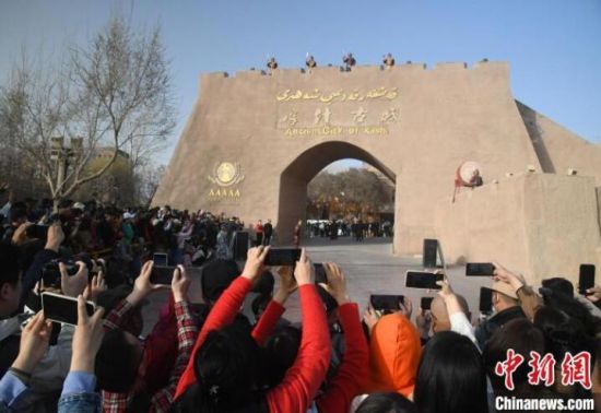 圖為來自五湖四海的游客在喀什古城觀賞開城儀式!O亭文 攝