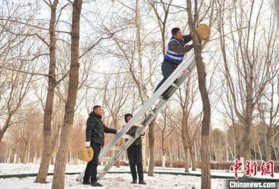 11月23日,趁著雪后天晴,吉林長(zhǎng)春友誼公園的工作人員忙著維護(hù)樹上的草編鳥巢,并投放了鳥糧。該公園生態(tài)環(huán)境好、野生鳥類多,園方已經(jīng)連續(xù)三年在園區(qū)設(shè)置百余個(gè)草編鳥巢助鳥類安全過冬。