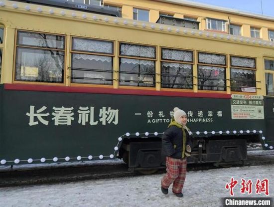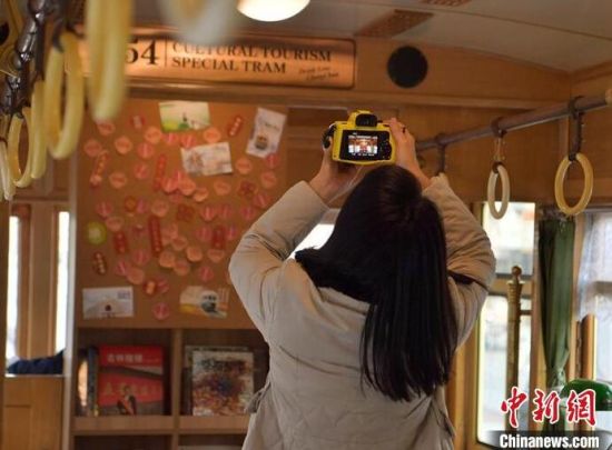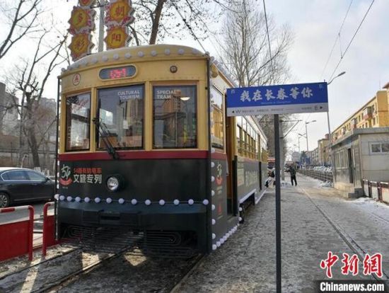 1月8日,吉林長(zhǎng)春,一輛54路有軌電車文旅專列吸引游客打卡拍照。該專列外形復(fù)古,車廂布置獨(dú)具特色,游客預(yù)約后可購(gòu)票乘車體驗(yàn)車內(nèi)及市區(qū)沿線的人文風(fēng)情。