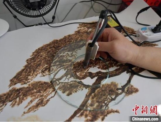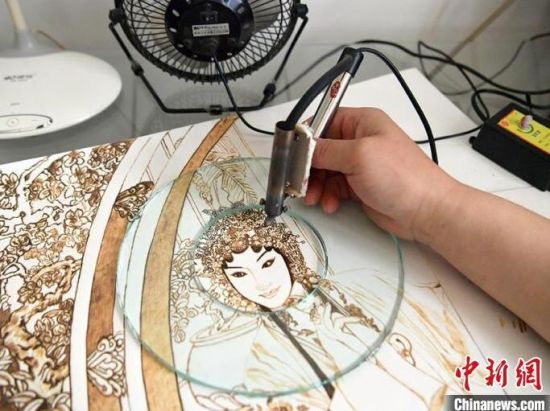王巖正在創(chuàng)作烙畫(huà)作品。
