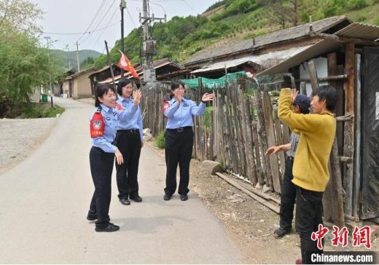 “女子警務(wù)團(tuán)”來(lái)到村里走訪(fǎng)。崔藝琳(右一)說(shuō),轄區(qū)里很多村子道路難行,但從沒(méi)阻止她們前行的腳步!埇 攝