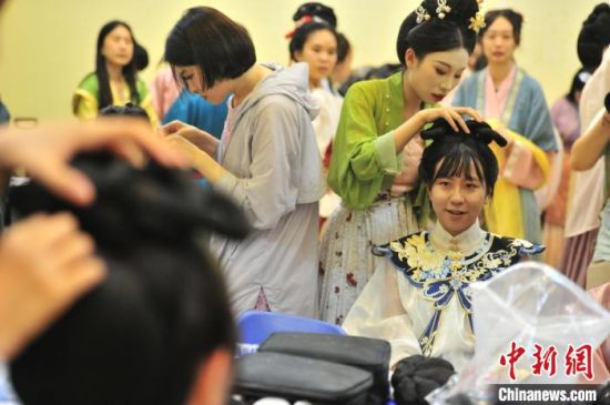 7月9日,吉林四平,2024年全國臺聯(lián)第二十一屆臺胞青年千人夏令營吉林分營的30余位臺胞青年參加傳統(tǒng)文化講座,學(xué)習(xí)漢服禮儀、漢服種類劃分等知識,并第一次穿上漢服進行體驗,感受傳統(tǒng)文化之美。圖為臺胞青年在進行漢服妝造。高龍安 攝