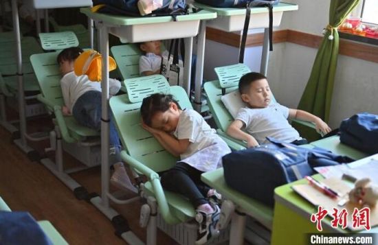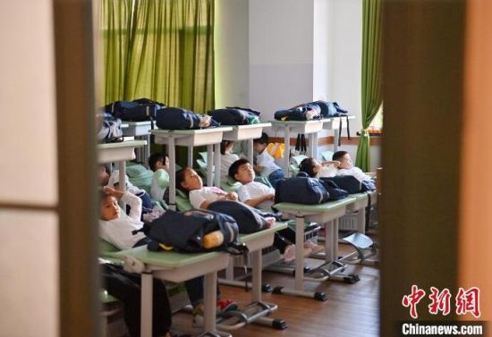 9月5日,在長春南湖實(shí)驗(yàn)中海小學(xué),學(xué)生們?cè)凇翱商墒健闭n桌椅上午睡。目前,吉林省有多所學(xué)校已啟用“可躺式”課桌椅,學(xué)生們中午可以躺著休息。中新社記者 張瑤 攝