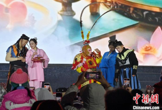12月5日,在長(zhǎng)春市動(dòng)植物公園,“孫悟空”在與游客互動(dòng)。當(dāng)天,該園“西游記主題樂園”重新開放,吸引全國(guó)各地游客"沉浸式”體驗(yàn)中國(guó)傳統(tǒng)文化。 中新社記者 張瑤 攝