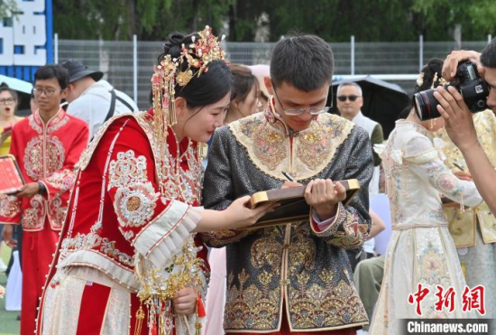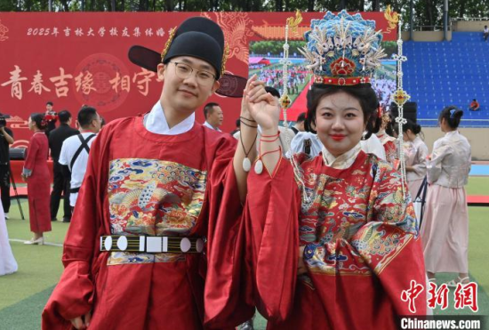 6月21日,吉林大學(xué)中心校區(qū)舉行2025年校友集體婚禮,36對新人從四面八方相聚在母校,在眾人矚目下有序步入婚禮主舞臺,沿途得到學(xué)弟學(xué)妹們的熱情祝福。中新社記者 張瑤 攝