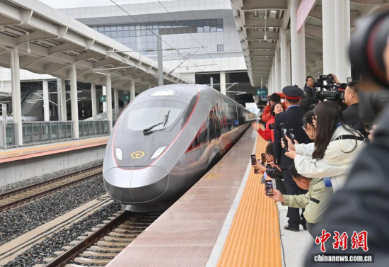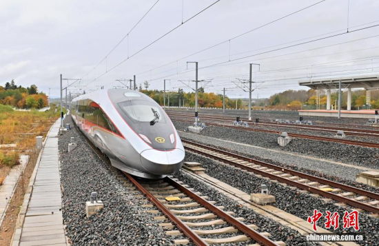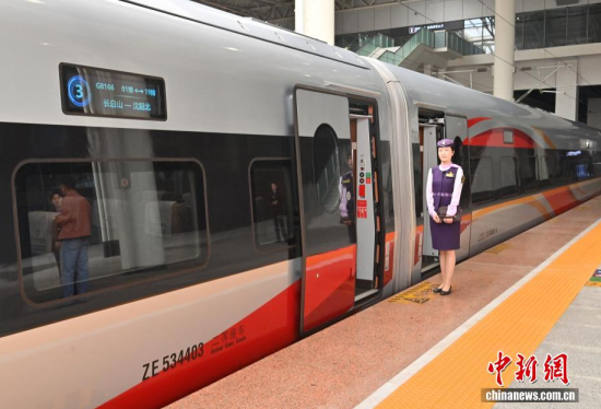 9月28日,G8166次列車從長白山站始發(fā),駛向終點站沈陽北站,沈白高鐵正式開通運營,結(jié)束了吉林省通化、白山兩市不通高鐵的歷史,北京朝陽站、沈陽北站至長白山站的最短旅行時間分別為4小時33分、1小時53分。作為中國東北高鐵網(wǎng)重要組成部分,該線路對暢通區(qū)域經(jīng)濟循環(huán)、促進沿線旅游資源開發(fā)等具有重要作用。中新社記者 張瑤 攝
