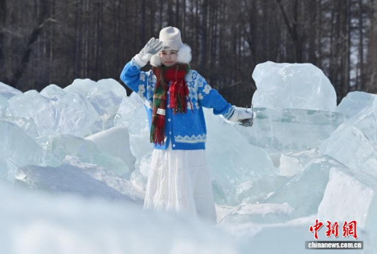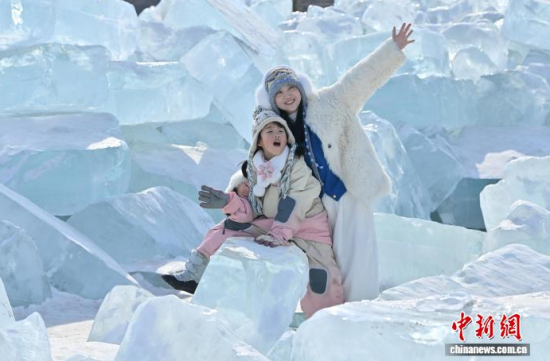 2月9日,在長春凈月潭國家森林公園內,由水庫天然冰塊堆砌而成的“藍冰”景觀,吸引市民打卡拍照。“藍冰”是指致密堅硬的冰,因冰內部空氣被擠掉而變得晶瑩透徹,這時陽光中波長較短的藍光被致密堅厚的冰層散射,冰塊便呈現(xiàn)出水晶般美麗的藍色。中新社記者 張瑤 攝